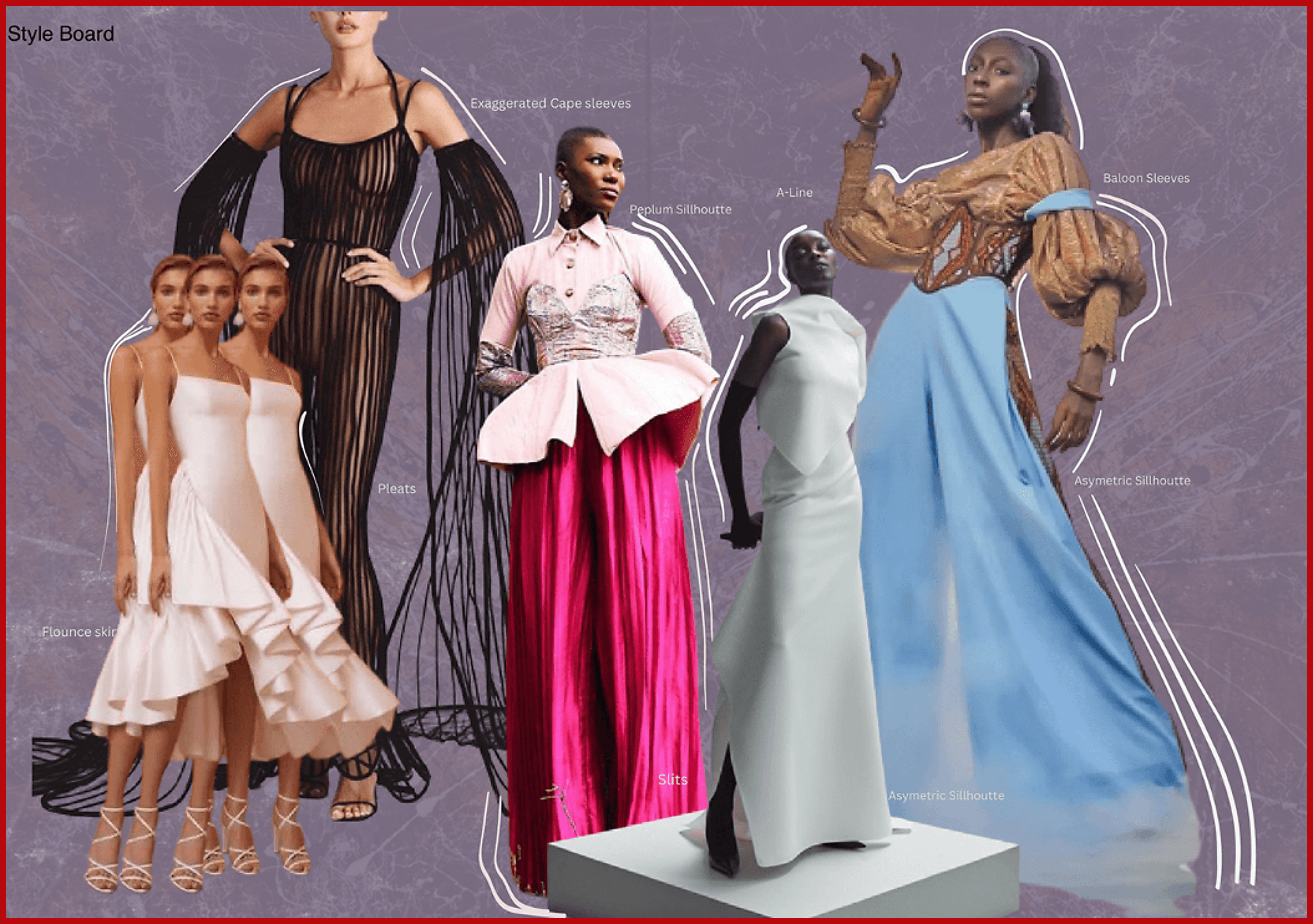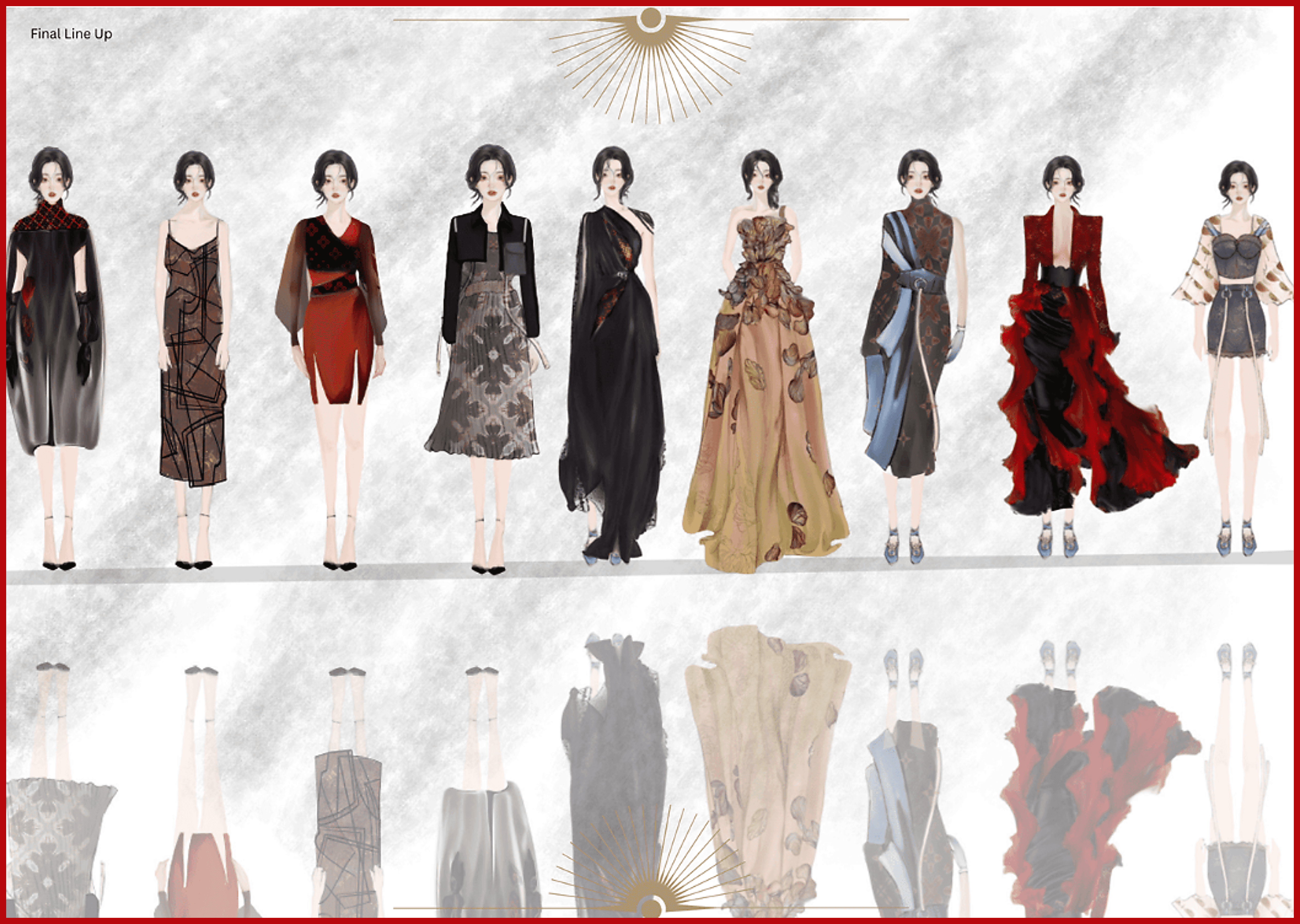 A couture concept exploring the tension between fire and softness—ember reds, shadow blacks, and whispering organza—translated into sculptural silhouettes and layered textures. From story and style boards to final lineup, it frames feminine strength through meticulous craft and dramatic form.